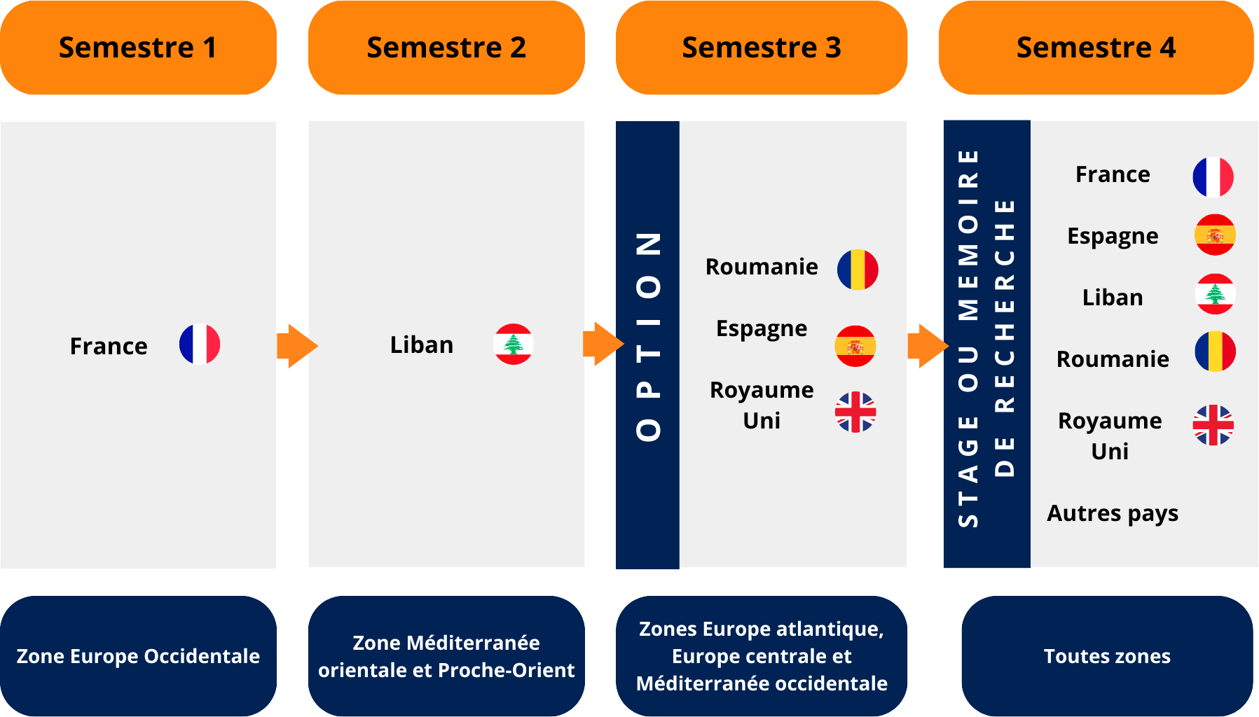 Tout au long de leurs deux années dans le JANUS Master, les étudiants embarquent pour un voyage en France, au Liban et, en option, au Royaume-Uni, en Espagne ou en Roumanie. Ce programme favorise l'immersion culturelle, le développement personnel, l'amélioration des compétences linguistiques, la création de réseaux internationaux, l'excellence académique, l'ouverture d'esprit et l'expérience professionnelle internationale. Ces impacts exceptionnels contribuent collectivement au développement global des étudiants et à leur réussite sur un marché du travail mondialisé.